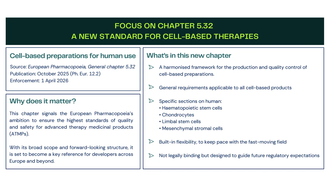 Scheduled for publication in October 2025 (12.2 edition of the Ph. Eur.) and entry into force on 01 April 2026, chapter 5.32 introduces a comprehensive framework for the production and quality control of cell-based preparations, while offering the flexibility required to address the rapidly evolving nature of the field. While not legally binding, the chapter provides an extensive set of general requirements common to all cell-based preparations, together with four detailed sections outlining specific requirements for human haematopoietic stem cells, human chondrocytes, human limbal stem cells, and human mesenchymal stromal cells.